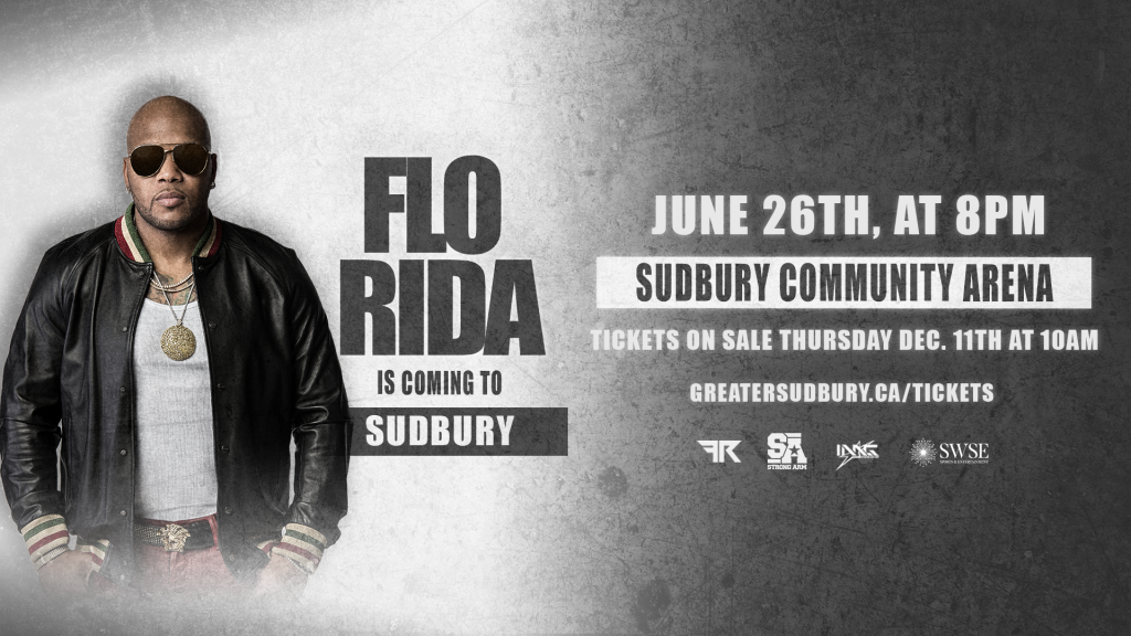 Pre-sale for this event will take place on Thursday, December 11th from 10:00am to 10:00pm, with tickets officially on sale on Friday, December 12th starting at 10:00am. Tickets will be available both in-person at the Sudbury Arena Box Office and online HERE. Doors for Flo Rida at the Sudbury Community Arena will open at 7:00pm, with the show starting at 8:00pm.